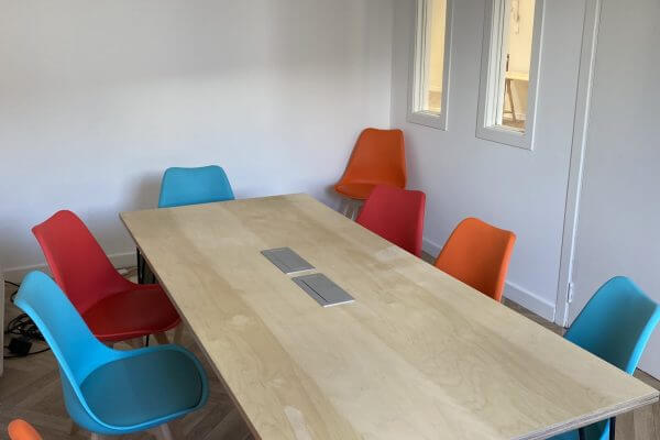 Our private second‑floor meeting room includes an 8‑seat board table with built‑in power, a TV for screen sharing, and convenient access to a kitchenette on the same floor. As a result, it’s an easy, comfortable choice for focused work or small group sessions.