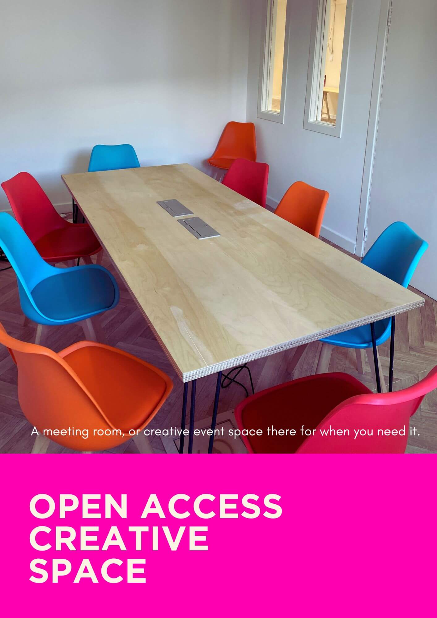 The event space is a private, second floor event space (9m X 18m), flooded with natural light, a fully enclosed internal meeting room, with whiteboards, tables and chairs (for 3Suitable for exhibitions, rehearsals and classes, the space can easily be tailored to your specific event.